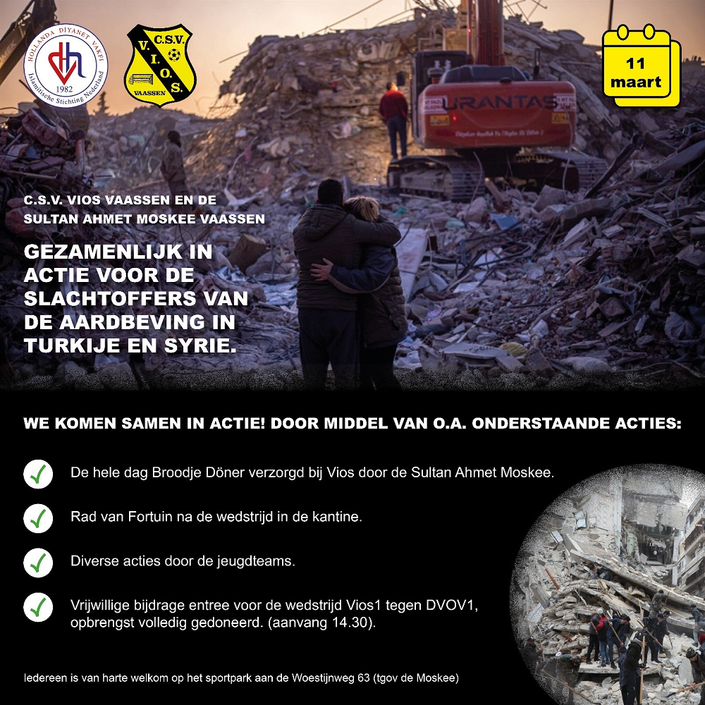Op 11 maart zullen de gebruikelijk entreegelden en de jeugdverloting voor de wedstrijd Vios1 tegen DVOV1, omgezet worden naar een vrijwillige bijdrage, deze opbrengst wordt volledig gedoneerd.