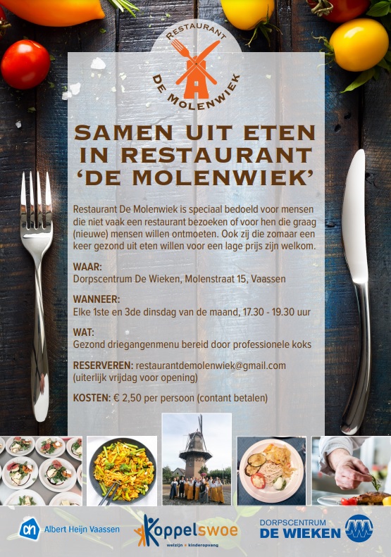 Restaurant De Molenwiek is speciaal bedoeld voor mensen die niet vaak een restaurant bezoeken. Of voor hen die graag (nieuwe) mensen willen ontmoeten. Ook mensen, jong en oud, die zomaar een keer gezond uit eten willen voor een lage prijs zijn welkom. Het restaurant is elke 1e en 3e dinsdag van de maand geopend van 17.30-19.30 uur waar je kunt genieten van een gezond driegangenmenu dat wordt bereid door professionele koks.
