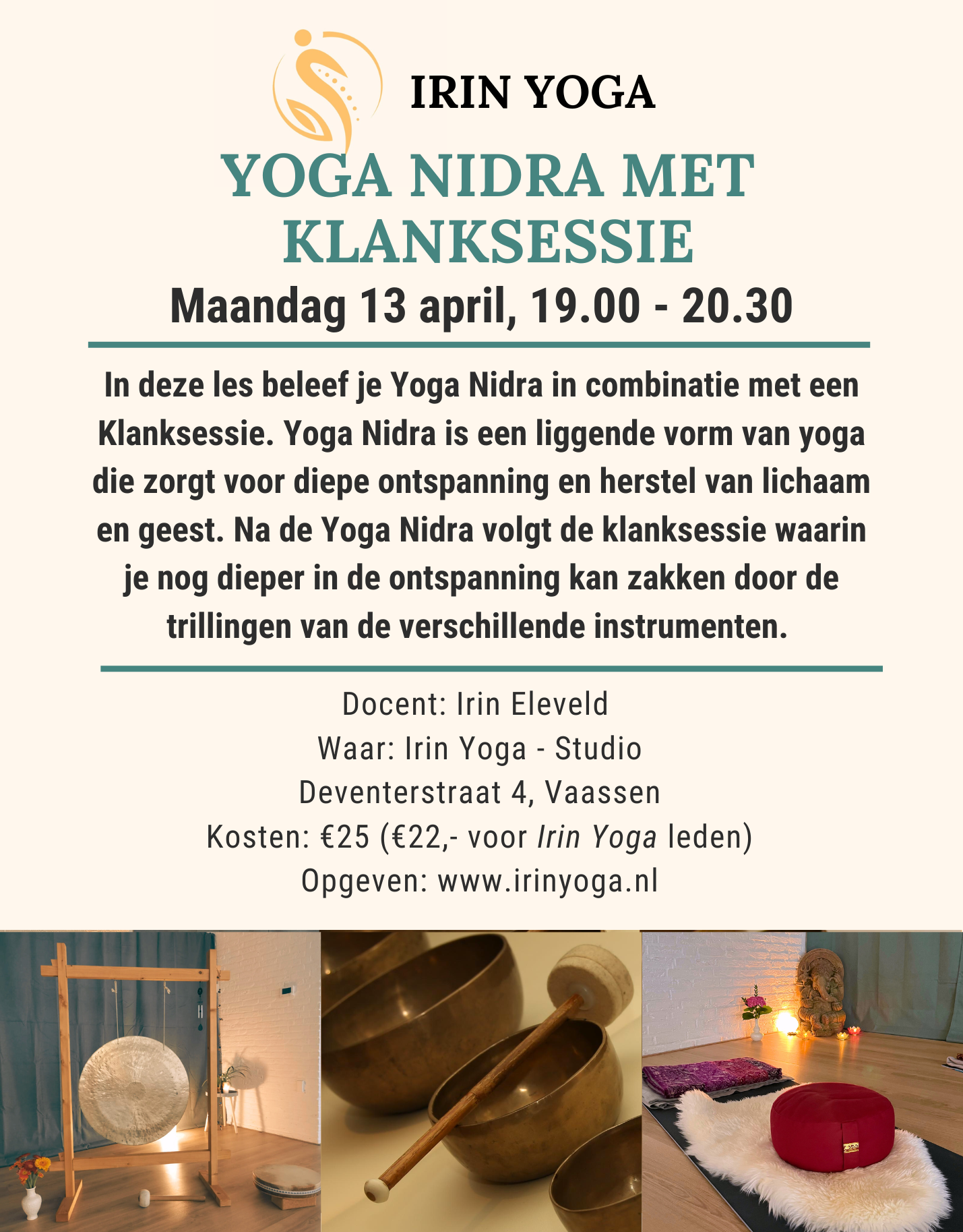 De Yoga Nidra met Klanksessie vindt plaats op maandag 13 april van 19.00 tot 20.30 en de Yin Yoga in Concert vindt plaats op zaterdag 25 april van 10.00 tot 11.45 in de Irin Yoga – Studio aan de Deventerstraat 4 te Vaassen. Aanmelden kan via www.irinyoga.nl. Irin Yoga is daarnaast te volgen op Instagram, Facebook en LinkedIn.