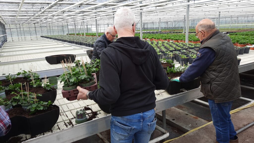 Daarvoor had een groot deel van deze groep vrijwilligers zich verzameld bij een kwekerij hier in de omgeving, die ruimte hiervoor beschikbaar beschikbaar had gesteld. En daar konden ze ook mooi op werkhoogte met de bakken aan de slag. De lege bloembakken waren vanuit Vaassen meegenomen. Na eerst een klein instructie want bij het bloembakken vullen hoort ook een stappen plan, kon men aan de slag.