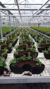 De gevulde bloembakken blijven nog even bij de kweker staan, zodat ze rustig verder kunnen groeien. Later zal de club van Wonder en Geweld deze weer gaan ophangen in de lantaarnpalen in ons mooie dorp.