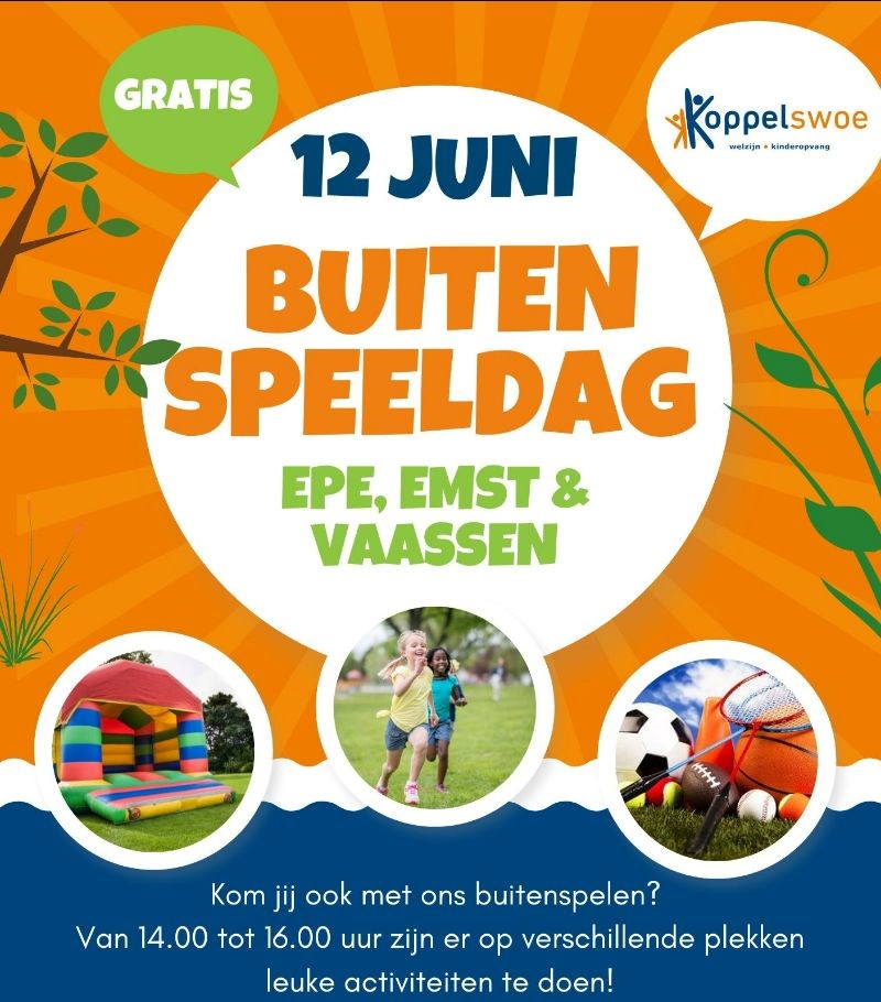 Ook in de gemeente Epe is buitenspelen tijdens de Buitenspeeldag allesbehalve saai of onveilig. Op 12 juni organiseren de sociaal werkers en buurtsportcoaches van welzijnsorganisatie Koppel-Swoe samen met vrijwilligers en partners in de wijk op drie locaties een gaaf (en gratis) Buitenspeel-evenement zodat zoveel mogelijk kinderen onbezorgd kunnen spelen. Want buitenspelen is gezond en leuk!