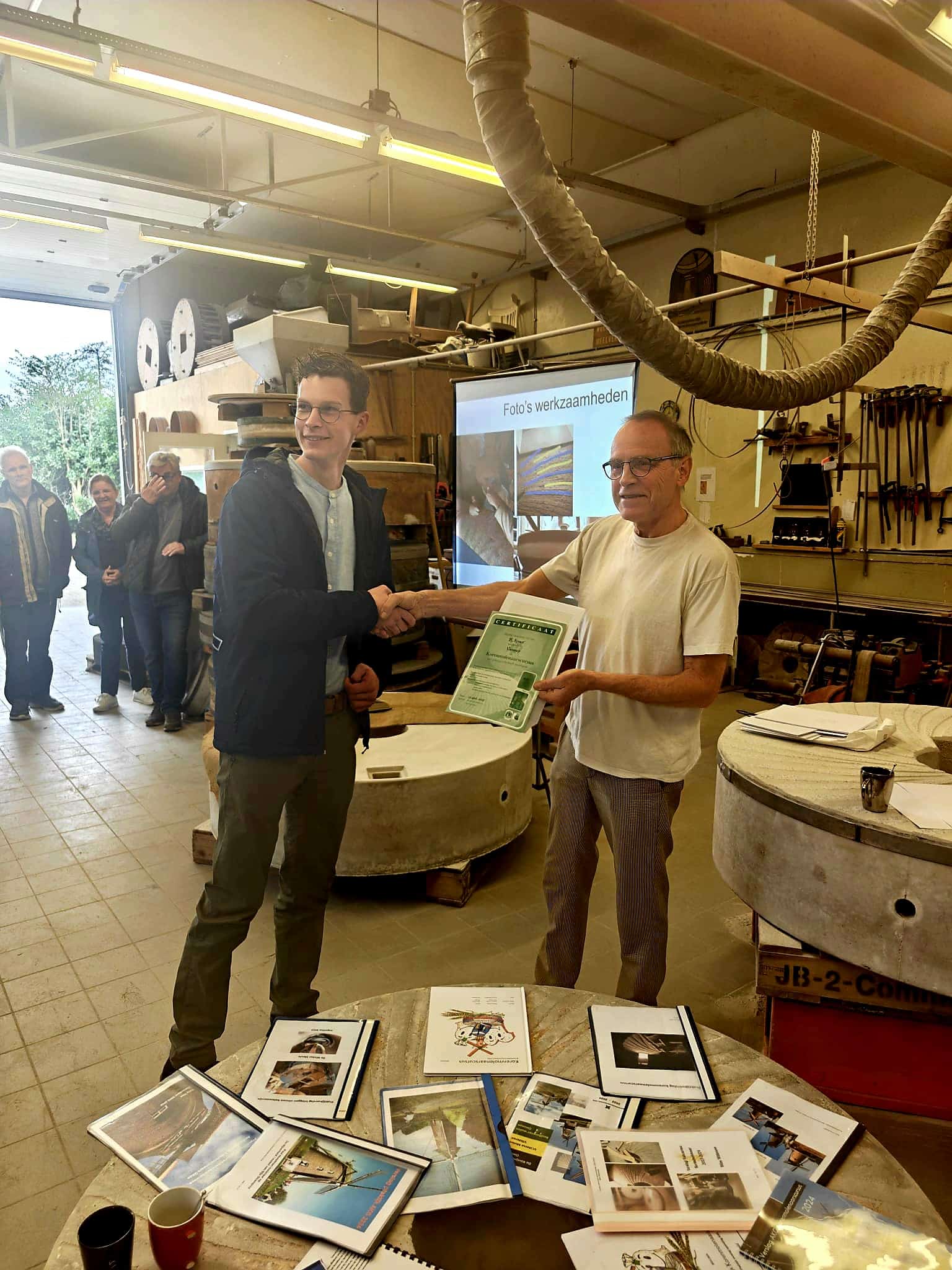 Voor Ramon Kroes was die vraag gauw beantwoord. Na een opleiding van anderhalf jaar heeft hij op zondag 13 april zijn certificaat als Ambachtelijk Korenmolenaar behaald. Dit certificaat wordt toegekend door het AKG, het Ambachtelijk Korenmolenaars Gilde, dat zich inzet voor het behoud van het traditionele ambacht van korenmolenaar en het malen van graan voor menselijke consumptie. Ramon mocht het prestigieuze certificaat in ontvangst nemen bij de enige molensteenmakerij ter wereld, gevestigd in Malden bij Nijmegen.