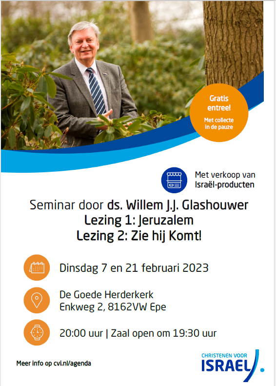 Op dinsdag 7 februari en op dinsdag 21 februari zijn er twee studieavonden met ds. Willem J. J. Glashouwer, werkzaam voor Christenen voor Israël International.