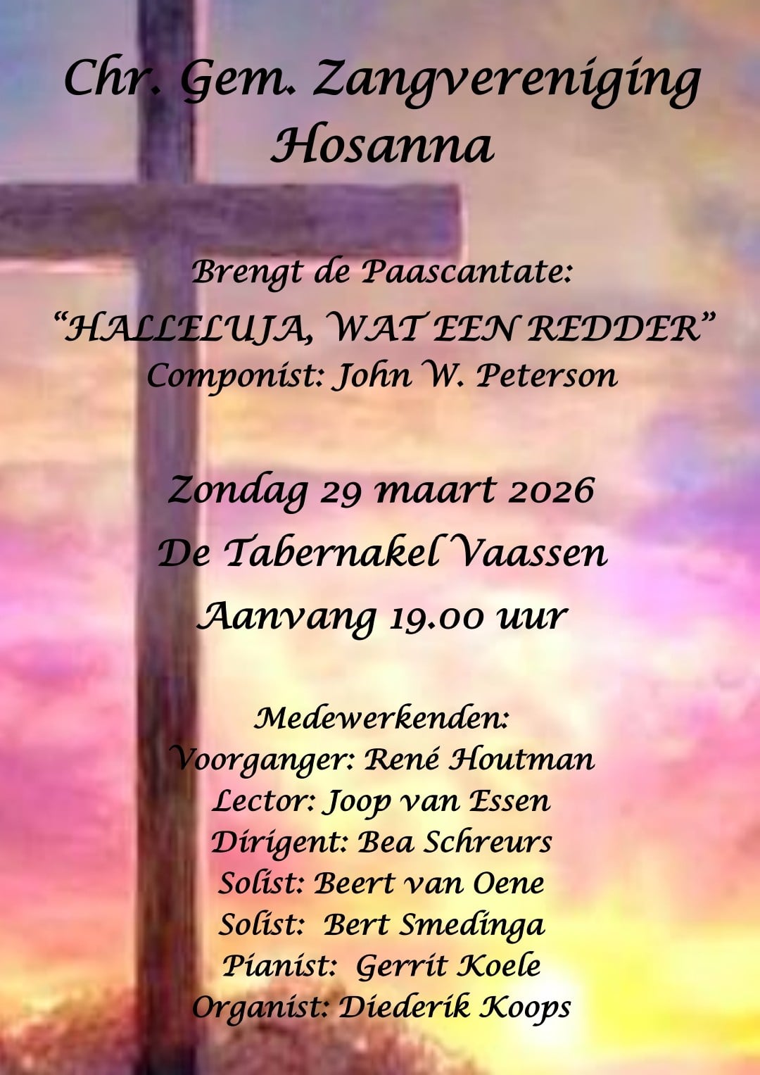De muziek van John. W. Peterson is voorzien van een aansprekende gezongen Nederlandse tekst die zeker de toehoorders zal boeien, ontroeren en meenemen in dit Bijbelse verhaal. Voorafgaand en afsluitend aan deze Cantate is er ook ruimte voor, in deze Paastijd, passende samenzang. Deze Cantate werd, door Hosanna, al diverse malen in kerken op de Veluwe uitgevoerd. Het koor en de kerkelijke gemeente van de Tabernakel nodigt U van harte uit om deze Cantate mee te beleven en zo met koor en belangstellenden een start te maken naar Goede Vrijdag en Pasen.
