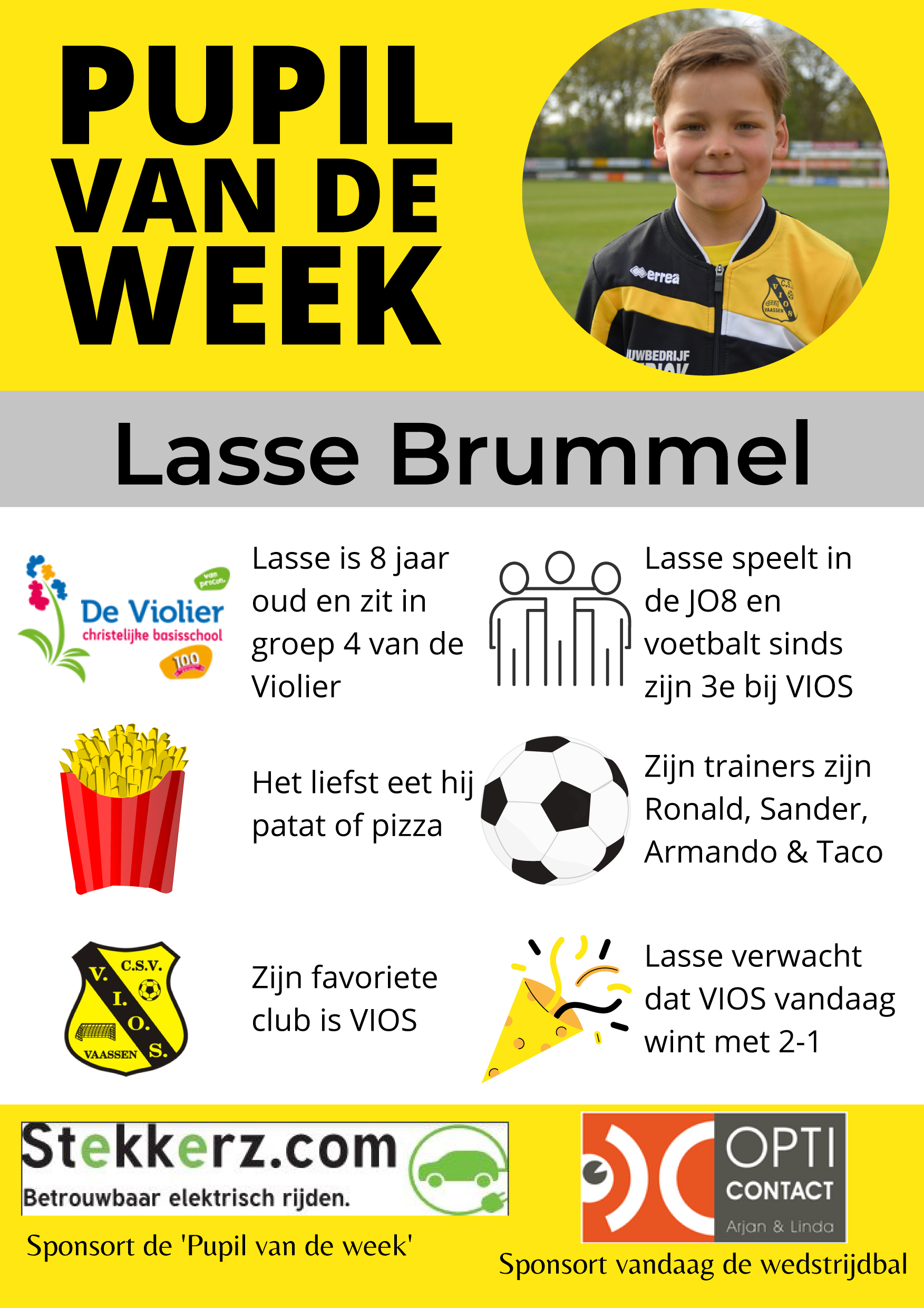 Lassen is 8 jaar oud en zit in groep 4 van de Violier. Hij speelt in JO8 en Voetbalt sinds zijn 3e bij Vios. Hij eet het liefst patat of piza