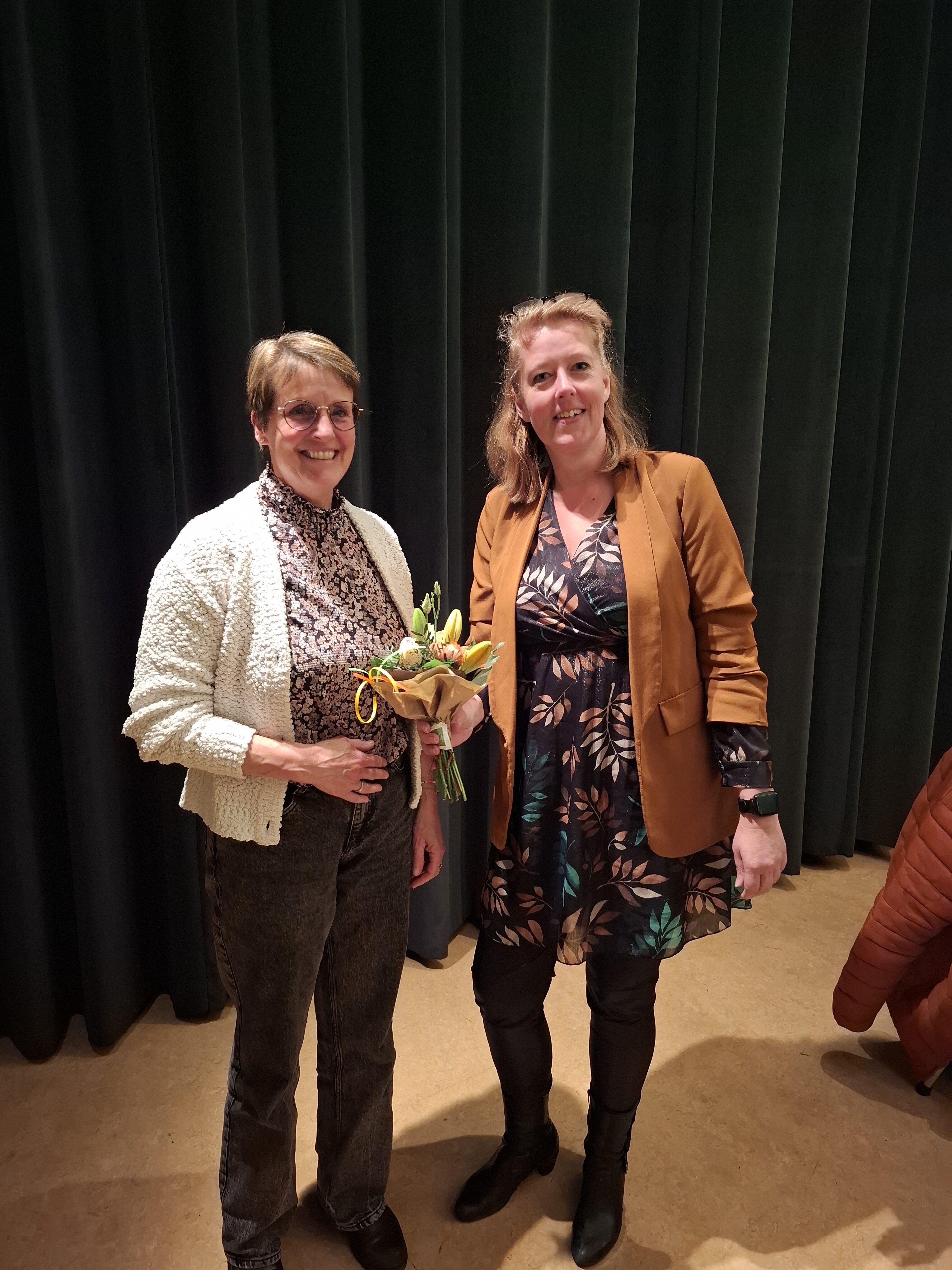 Herma Stegeman is al 25 jaar met hart en ziel verbonden aan Nenoni en werd dan ook tijdens de jaarvergadering verrast door voorzitter Johanna ten Brinke met een zeer verdiend bloemetje (eigen foto).