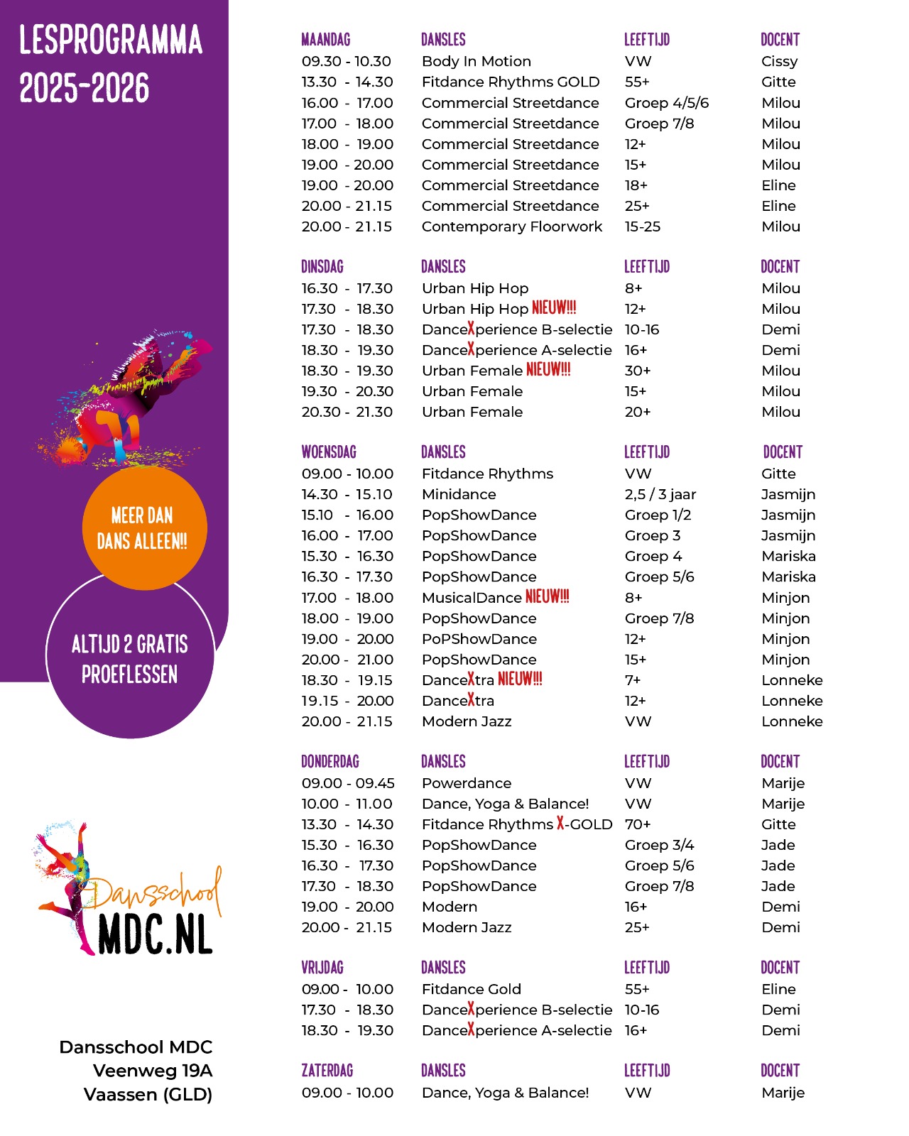 Voor het sportjaar 2025-2026 zijn er meerdere nieuwe lessen toegevoegd aan het lesaanbod. Hierdoor staan er 40 lessen in de week op het lesprogramma, deze worden gegeven door een gediplomeerd en enthousiast team van 11 (dans)docenten!