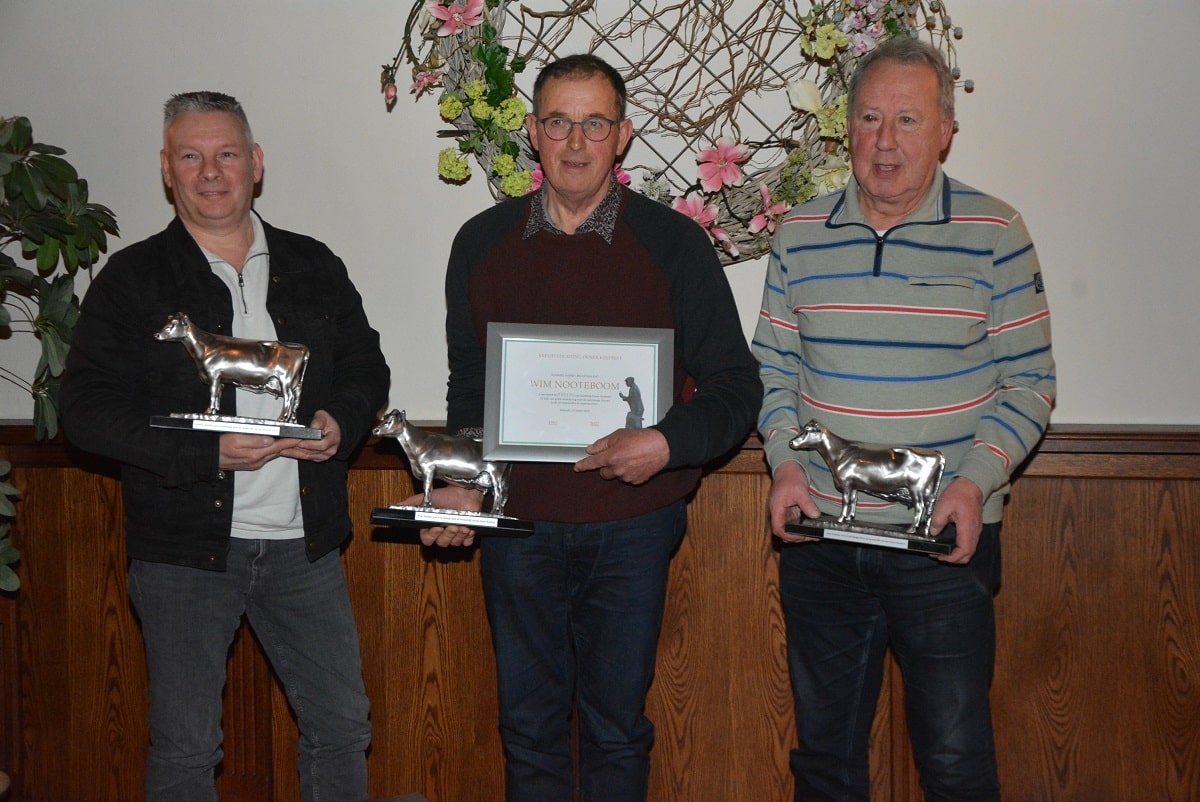 Drie scheidende bestuursleden werden in het zonnetje gezet. Reinder Kluin, die ruim elf jaar zorg droeg voor de warenmarkt, Arie Dalhuisen die vijftien jaren nauwgezet de penningen beheerde en Wim Nooteboom, de eerst verantwoordelijke voor koeien op deze unieke najaarsmarkt. Ze ontvingen de bij het Koefeest gangbare Zilveren Koe en werden in de bloemetjes gezet.