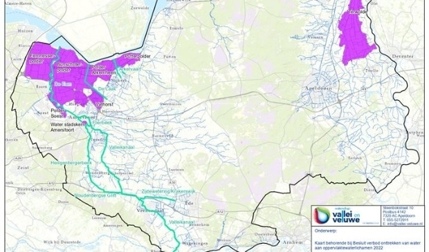 Vanaf woensdag 18 mei 2022 geldt in het werkgebied van Waterschap Vallei en Veluwe een verbod op onttrekking uit oppervlaktewater waarop geen aanvoer mogelijk is. Het waterschap heeft hiertoe besloten vanwege de aanhoudende droogte. Dit betekent dat water uit sloten en andere watergangen niet gebruikt mag worden voor bijvoorbeeld industrieel gebruik, landbouw of het besproeien van bomen en sportvelden. Het onttrekkingsverbod geldt voor onbepaalde tijd.