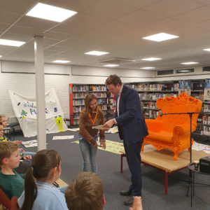 De jury werd gevormd door wethouder Heere en mevrouw Gregoire, voormalig medewerker Bibliotheek Noord-Veluwe. Wethouder Heere reikte het certificaat Voorleeskampioen uit aan Saar Slegers.