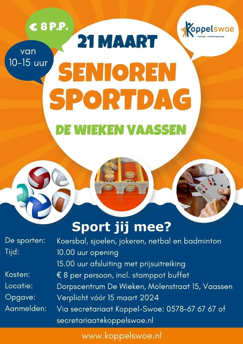 Op donderdag 21 maart 2024 organiseert Koppel-Swoe een seniorensportdag in dorpscentrum De Wieken in Vaassen. De seniorensportdag start om 10.00 uur en sluiten we rond 15.00 uur af met een prijsuitreiking.