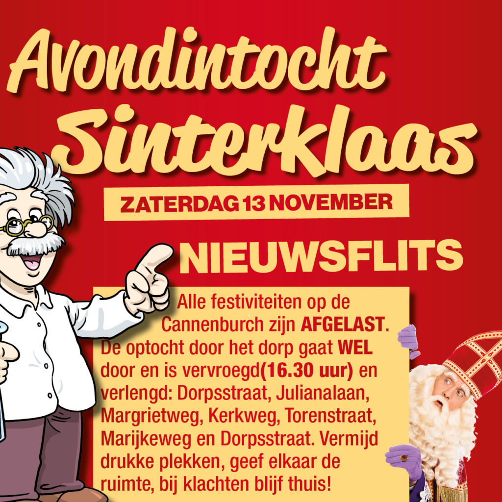 In verband met deze nieuwe maatregelen is in overleg met de gemeente, de ondernemersvereniging en de sinterklaascommissie besloten om de festiviteiten op het terrein van de Cannenburch te CANCELEN!!! De optocht gaat WEL door en is vervroegd naar 16.30 uur en verlengd zodat er voor een ieder voldoende ruimte is!