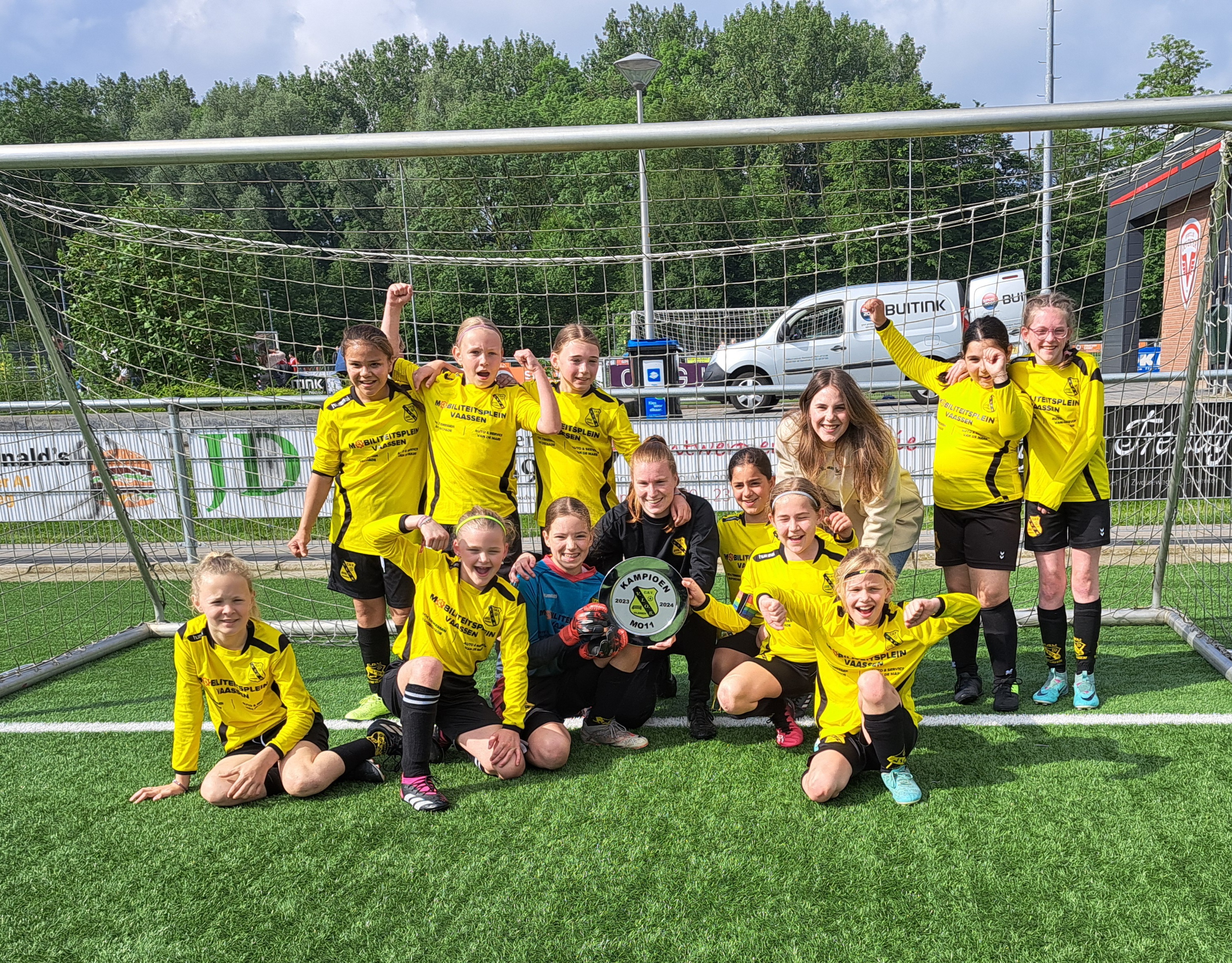 Het seizoen had natuurlijk niet beter kunnen eindigen! Alle speelsters hebben met veel plezier het afgelopen jaar gevoetbald. Onder leiding van Kirsten, Celeste, Rudolf en Britt leerden ze weer veel bij. En dat gaan ze nodig hebben voor het nieuwe seizoen. Dan wordt dit team namelijk de MO13. Dit betekent spelen op een heel veld, met buitenspel en grensrechters! De komende weken gaan ze zich hier al op voorbereiden, zodat ze er straks na de zomervakantie helemaal klaar voor zijn!