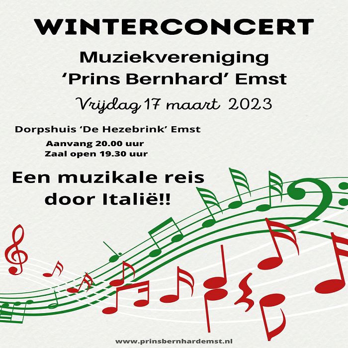 Het harmonieorkest van Prins Bernhard Emst neemt u op vrijdagavond 17 maart a.s. o.l.v. dirigent Jasper Esselink graag mee op een muzikale reis door Italië met nummers zoals The grapes of the sun, Sinfonia Italia, Festa Paesana en Queen of the Dolomites.